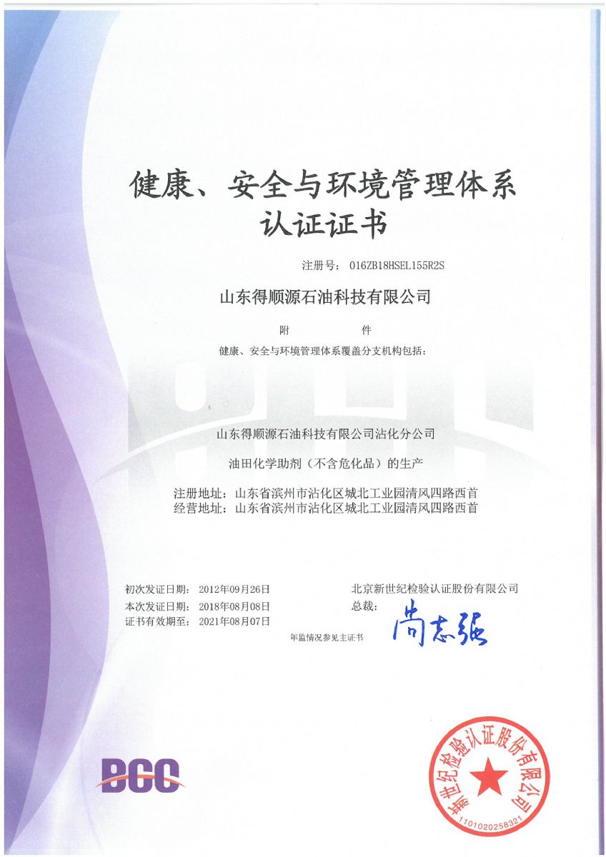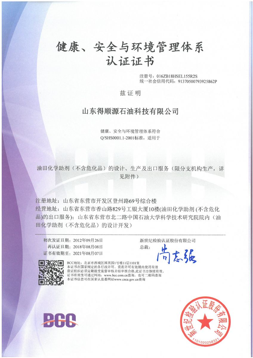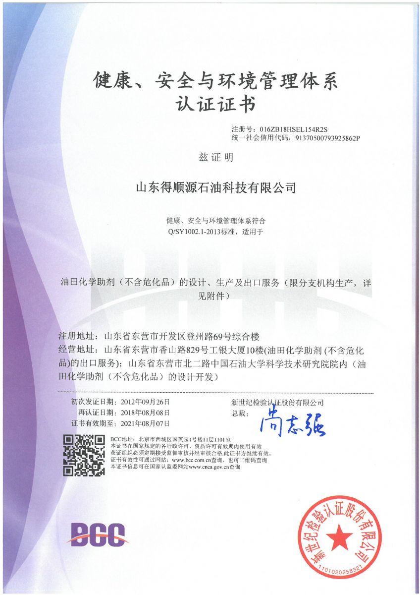 2018年8月,公司順利通過北京新世紀認證公司關于HSE認證的三年換證監督審核,并收到了最新版的中石化和中石油HSE證書。