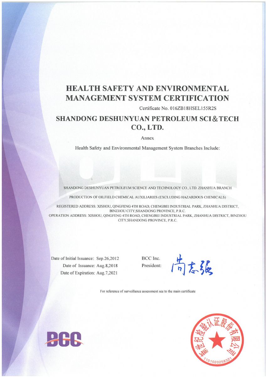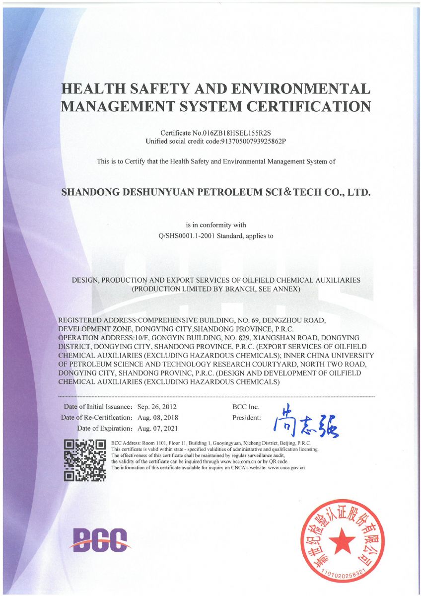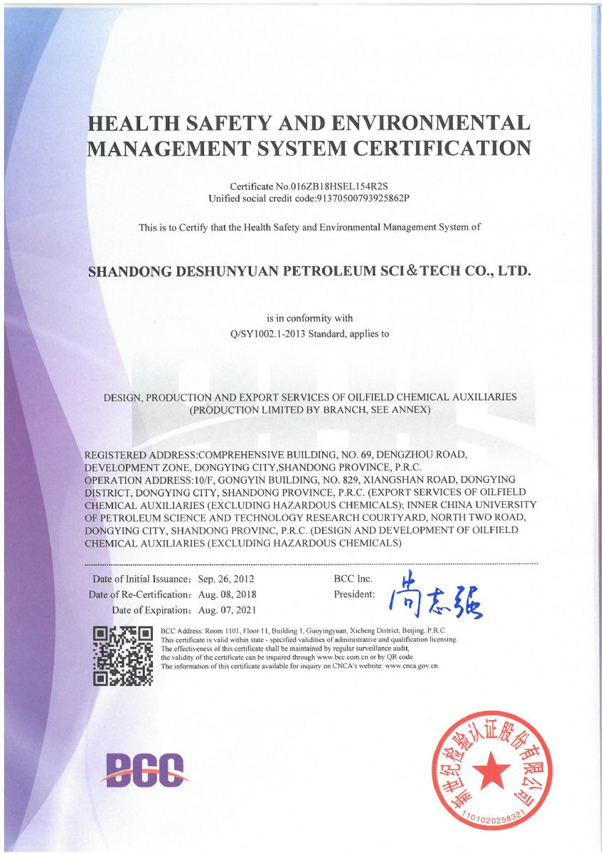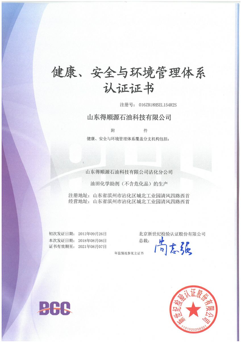 2018年8月,公司順利通過北京新世紀認證公司關于HSE認證的三年換證監督審核,并收到了最新版的中石化和中石油HSE證書。